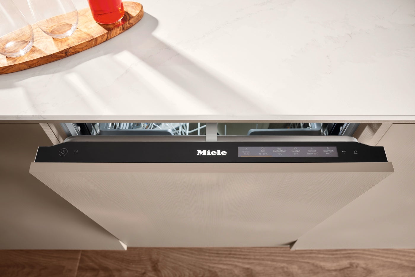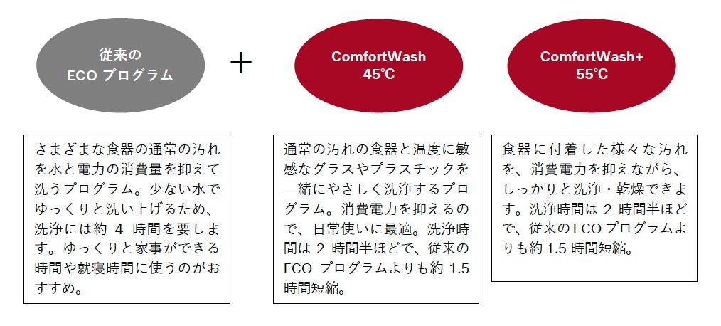 G 7000 リデザインモデルは、従来のECOプログラムに加えて「ComfortWash 45℃」「ComfortWash+ 55℃」という消費電力を抑えながら食器の種類に応じて最適な洗い上がりを叶える2つのプログラムを備えています。