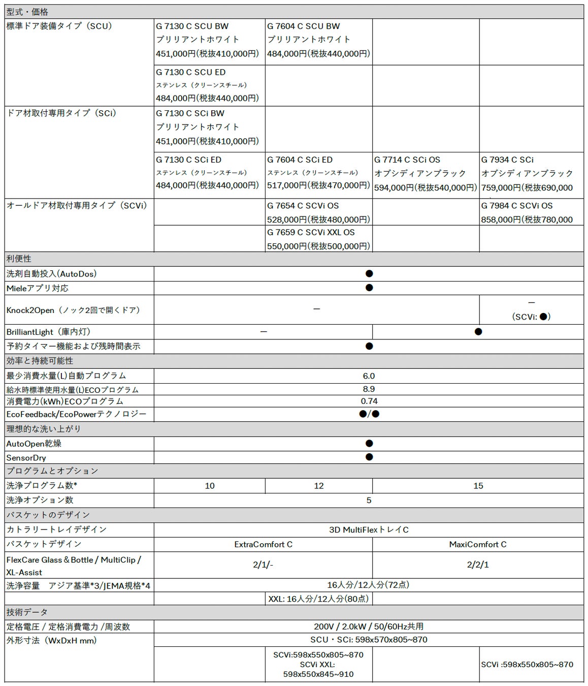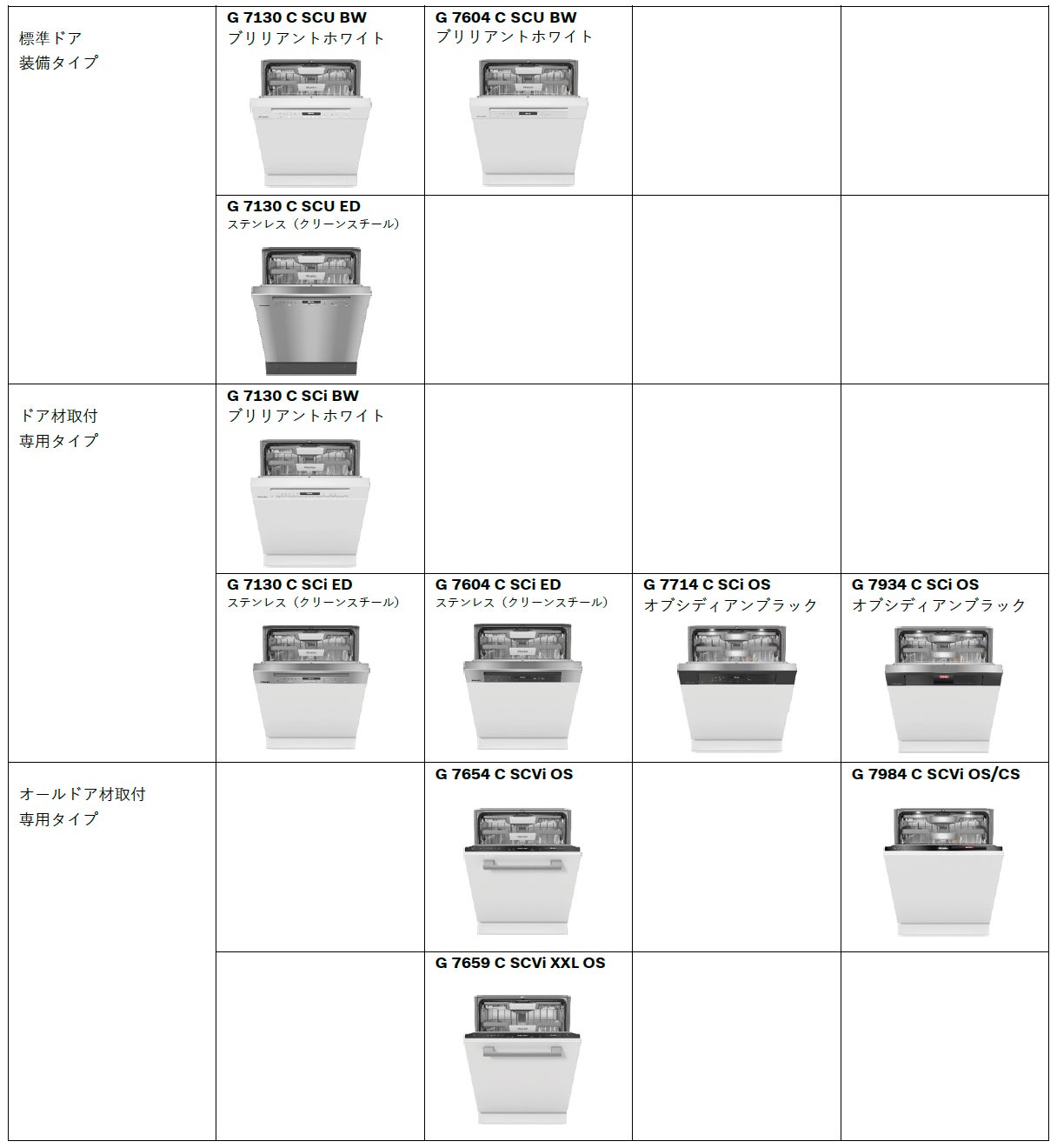 Miele食器洗い機G 7000 シリーズ リデザインモデル|一覧と主な仕様