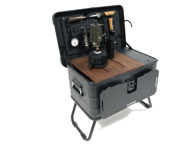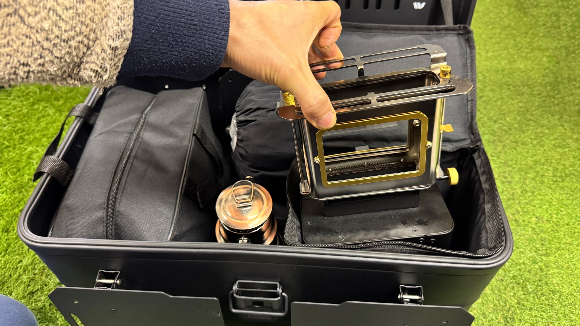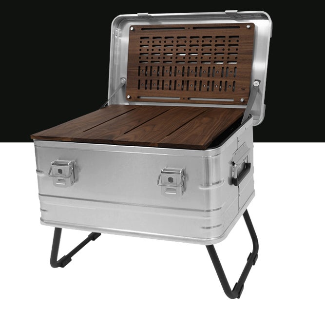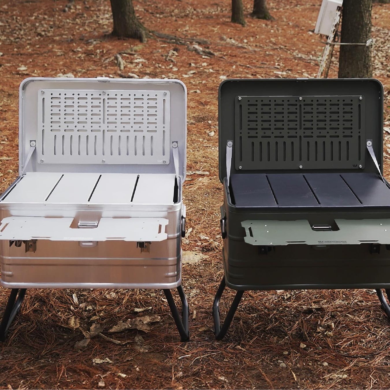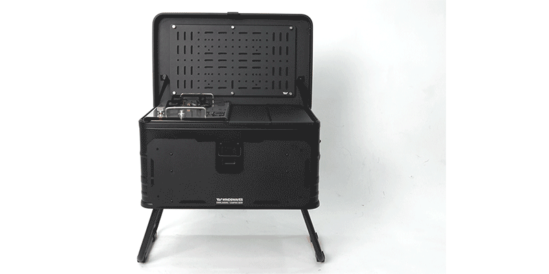 キャンプボックスの下部には折り畳みの脚が備え付けられています。普段は脚を畳んでおけば省スペースで邪魔になりません。キャンプのときは脚を広げて設置すれば、椅子に座ったときに作業しやすい丁度良いサイズになります。