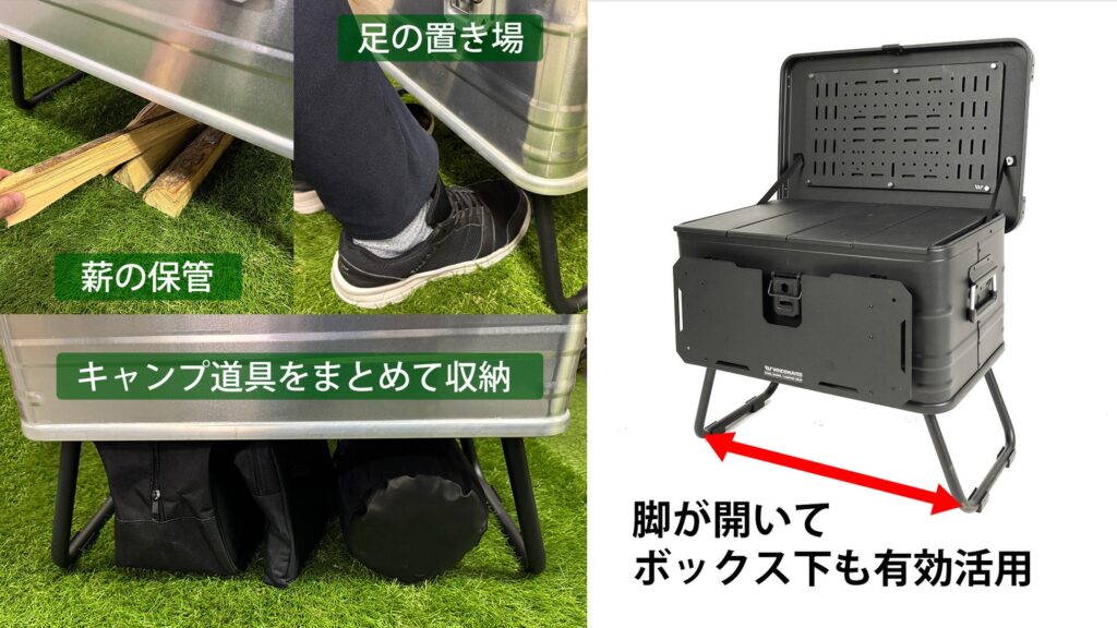薪の保管やキャンプ道具もまとめておけます。脚が邪魔にならないので、すぐに取り出せるのも便利です。特に椅子に座って調理したり、食事したり、リラックスしたりするとき、足がキャンプボックス下に入れられるので窮屈にならず楽に座って作業ができます。